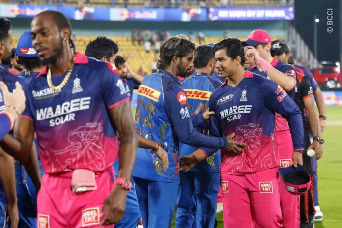 With the help of Sooryavanshi’s 14-ball blitzkrieg of 39 and Yashasvi Jaiswal’s brilliant undefeated 77, RR easily defeated Hardik Pandya’s Mumbai Indians. In the rain-shortened 11-overs-a-side match, their effort set the tone for a 150-run total.