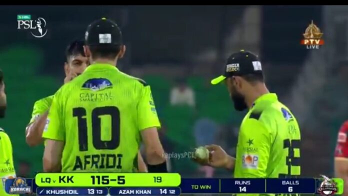 The controversial moment happened with Karachi needed 14 runs in the final over, and pacer Haris Rauf was set to bowl. At that moment, Lahore captain Shaheen Shah Afridi, Fakhar Zaman and Rauf were seen in discussion at the top of the run-up. During that exchange, the ball was passed around between them, which is common in pressure situations.