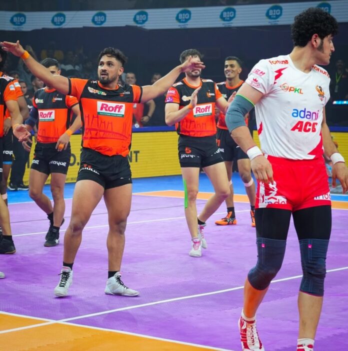 Thanks to their defensive efforts, U Mumba managed to stay within striking distance and, following a few Super Tackles, took a one-point lead. Anil Mohan scored several important points to help them maintain their momentum, and Ajit Chouhan helped out defensively. Additionally, Parvesh Bhainswal maintained his team’s lead by recording his 350th tackle in the PKL.