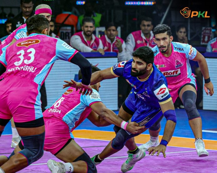 The Jaipur Pink Panthers gradually but steadily recovered with the score at 24–20 as the speed slowed. Before the reigning champs closed the door once more, Sahil and Deepanshu Khatri kept the scoreboard moving. His team leads by six points (26–20) going into the last quarter after Rahul Sethpal finished his High Five.
